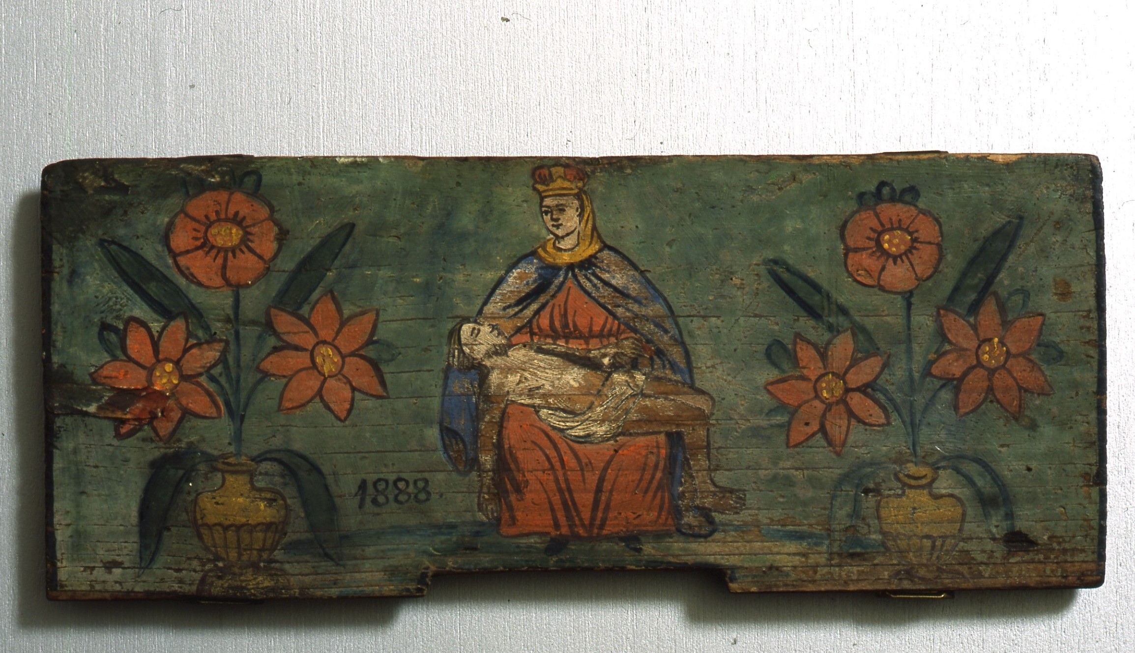 | Ključne besede | poslikana panjska končnica, nabožni motiv, iz Marijinega življenja, pieta |