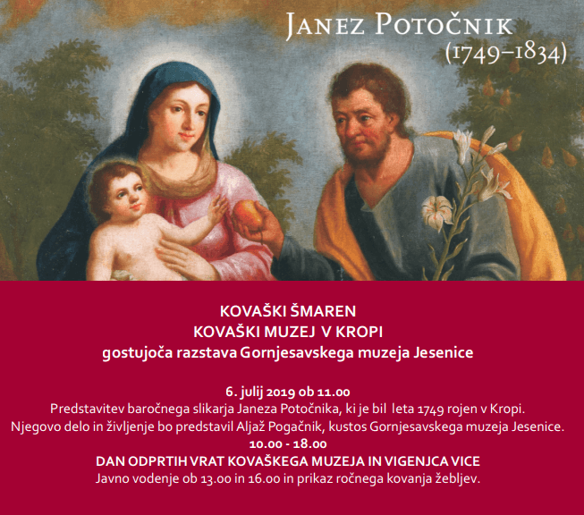 Na dan, ko v Kropi poteka kovaški šmaren, vas vabimo na slovesno odprtje gostujoče razstave Gornjesavskega muzeja Jesenice z naslovom Janez Potočnik (1749–1834). Na ogled bodo nekatera dela baročnega slikarja Janeza Potočnika , ki je bil leta 1749 rojen v Kropi. Njegovo delo in življenje bo predstavil Aljaž Pogačnik, kustos Gornjesavskega muzeja Jesenice.